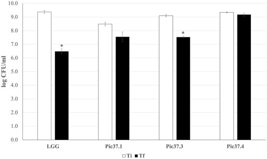In vitro tolerance of LAB to simulated gastrointestinal conditions. Cell counts of viable Latilactobacillus curvatus Pic37.1 (Pic37.1), Lactococcus lactis Pic37.3 (Pic37.3), Lactiplantibacillus plantarum Pic37.4 (Pic37.4) and Lacticaseibacillus rhamnosus GG (LGG) at the initial time point (Ti, white columns) and at the end of digestion (Tf, black columns) are shown. Data are reported as log colony-forming units (CFU)/mL recovered after plating bacterial cells at the beginning (initial time point: Ti) and at the end (final time point: Tf) of the simulated digestion process. Columns represent the mean ± SD of two independent experiments, each performed in duplicate. Statistical analysis was performed by Student’s t-test (* p < 0.05, Tf versus Ti for each strain).