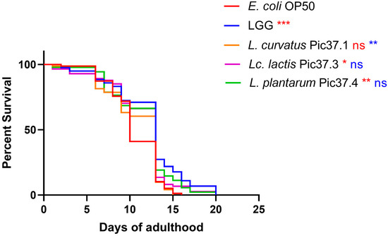 To this aim, C. elegans lifespan tests were conducted on nematodes separately fed each of the LAB strains starting from embryo hatching by comparing the survival curves with those of worms grown on LGG (probiotic control) or on the standard E. coli OP50 diet. The results reported in Figure 3 showed that, among the three LAB strains, L. plantarum Pic37.4 and Lc. lactis Pic37.3 exerted a significant increase in nematode lifespan as compared to E. coli OP50, with a survival curve almost overlapping with that of animals fed LGG (p < 0.05 and p < 0.01 vs. OP50, respectively). On the other hand, the lifespan of nematodes fed L. curvatus Pic37.1 was similar to that observed for animals fed E. coli OP50.
