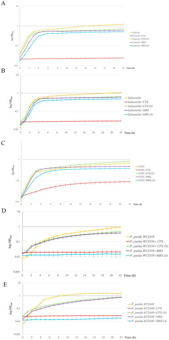 Antimicrobial activity of Lactiplantibacillus plantarum Pic37.4 cell-free supernatant. Growth curves of pathogens and spoilage bacteria grown in the presence of L. plantarum Pic37.4 cell-free supernatant (CFS, red lines); CFS neutralized to pH 6.5 (CFS (N), green lines); MRS (purple lines); MRS acidified to pH 4 (MRS (A), blue lines). Orange lines refer to reference growth curves of Listeria monocytogenes OH (A), Salmonella enterica serovar Typhimurium LT2 (B), enterotoxigenic Escherichia coli (ETEC) K88 (C), Pseudomonas putida WCS358 (D) and Pseudomonas putida KT2440 (E). Bacterial growth was monitored by measuring the OD600 at 1 h intervals for 22 h and expressed as log OD600. Experiments were performed in triplicate with at least one independent experiment for each strain tested.