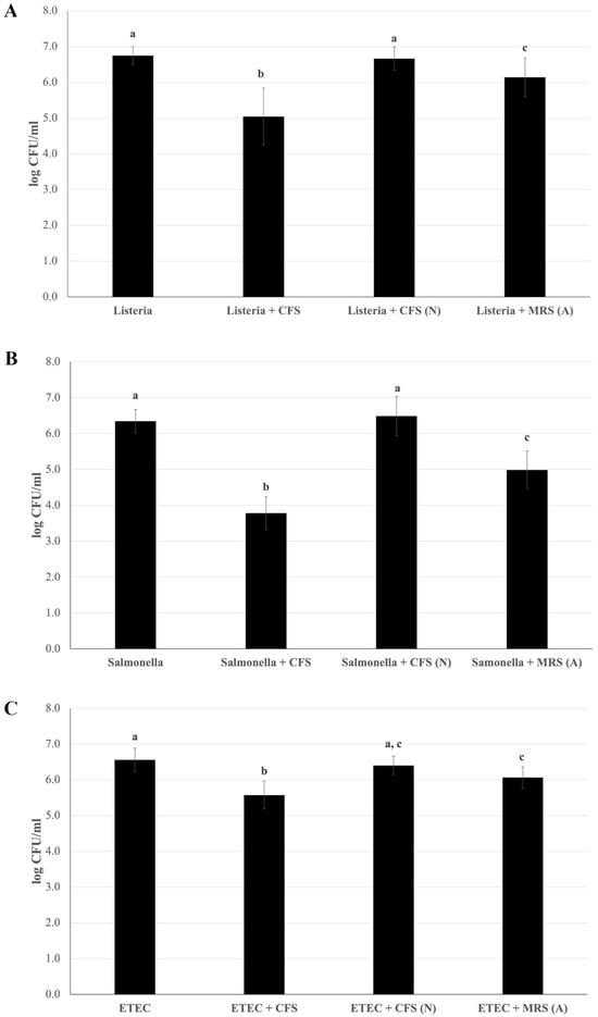 Reduction in pathogen adhesion to Caco-2 cells mediated by Lactiplantibacillus plantarum Pic37.4 cell-free supernatant. Viable counts (expressed as means and relative standard deviations of log CFU/mL) of pathogen strains after adhesion to Caco-2 cells alone or in the presence of cell-free supernatant (CFS); CFS neutralized to pH 6.5 (CFS (N)); MRS acidified to pH 4: MRS (A). The pathogens are Listeria monocytogenes OH (A), Salmonella enterica serovar Typhimurium LT2 (B) and enterotoxigenic Escherichia coli (ETEC) K88 (C). Experiments were performed in duplicate, with three independent experiments for each pathogen. Statistical analysis was evaluated by (A) Welch one-way ANOVA with the Tamhane post hoc test (p ≤ 0.001, Listeria + CFS versus Listeria, Listeria + CFS (N) and Listeria + MRS (A); p ≤ 0.05, Listeria + MRS (A) versus Listeria and Listeria + CFS (N)); (B) one-way ANOVA (p < 0.001); and (C) one-way ANOVA (p < 0.001, ETEC versus ETEC + CFS; p < 0.01, ETEC + MRS (A) versus ETEC and ETEC + CFS; ETEC + CFS versus ETEC + CFS (N)). Distinct letters indicate statistically significant differences.
