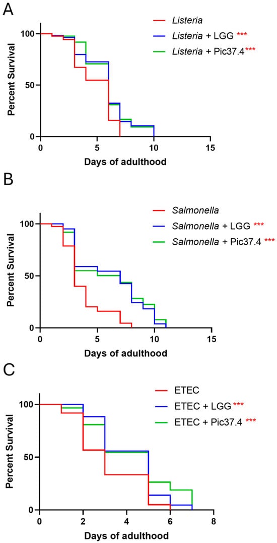In vivo ability of Lactiplantibacillus plantarum Pic37.4 to counteract pathogen infection. Kaplan–Meier survival plots of C. elegans fed L. plantarum Pic37.4 in a 1:1 co-culture with Listeria monocytogenes OH (A), Salmonella enterica serovar Typhimurium LT2 (B), or enterotoxigenic Escherichia coli (ETEC) K88 (C). Experiments were conducted in triplicate. Differences between groups were assessed with the log-rank (Mantel–Cox) test. Worms fed the pathogen alone served as control (*** p < 0.001; n = 80 per condition in each experiment).