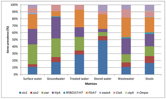 Conversely, the tcpA gene carried by V. cholerae and the eaeA and rfbO157 genes carried by E. coli O157:H7 were the least frequently detected in the isolates from the various matrices (Figure 1). The low prevalence of these genes suggested a lower overall risk of infection with these specific pathogenic strains in the tested samples. Overall, these results provide insight into the distribution and prevalence of specific virulence-associated genes of pathogenic STEC, E. coli O157:H7, and V. cholerae strains in different matrices. Understanding the presence of these genes in various sources is valuable for assessing the potential health risks associated with water and environmental contamination and can aid in implementing appropriate control measures to mitigate these risks.