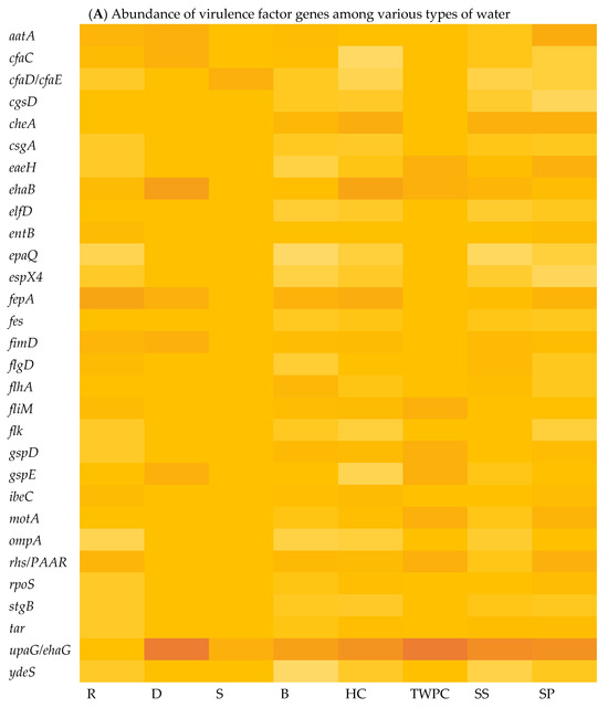 Whole-genome sequencing (WGS) and virulome analysis of E. coli isolated from the various types of water indicated variations in the virulence factor genes (VF genes) among the various water types. Virulome analysis identified a total of 153 VF genes across all the selected samples. The different sample types showed different numbers of VF genes. In Figure 3A, which shows the relative abundance of virulence factor genes in different water sources, the adhesion- and invasion-related genes, such as the upaG and the ehaG trimeric autotransporter adhesins (TAAs), were consistently the most frequently identified genes in most of the E. coli isolates, occurring 92 times. These TAAs have been characterised previously by Totsika et al. [43]. According to these authors, ehaG from enterohaemorrhagic Escherichia coli (EHEC) O157:H7 and upaG from uropathogenic E. coli (UPEC) were found to share similar properties for pathogenesis, but these TAAs also showed differences. While ehaG mediates binding to colorectal epithelial cells, upaG mediates binding to bladder epithelial cells. Moreover, the availability of genome sequencing through WGS has significantly increased the amount of information generated in laboratory testing using conventional methods. By sequencing the entire genome, researchers can uncover a broader range of virulence factors and genetic markers associated with diarrhoeal diseases [44]. In this case, the study identified specific VF genes, including hcp1/tssD1, hlyE, mrkA, and mrkB, which are known to be associated with diarrhoeal diseases.