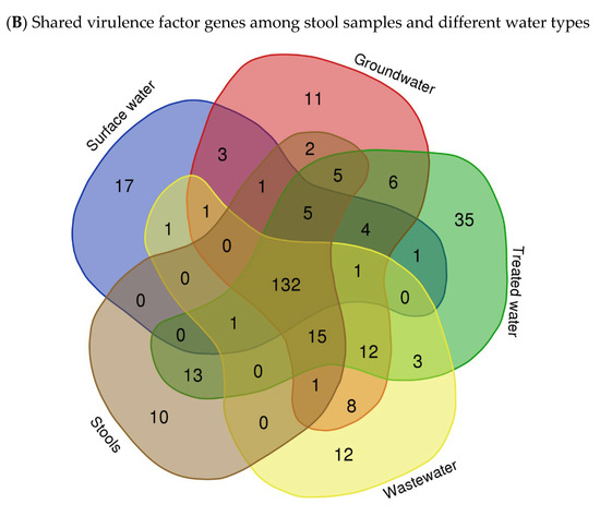 These data clearly demonstrate the value of WGS as a powerful tool that goes beyond traditional epidemiological methods, enabling a comprehensive and thorough detection of VF genes and ARGs of the studied pathogen such E. coli. In addition, in this study, it was shown that one ARG was shared between surface water and drinking water in households; the persistence of ARGs in HH drinking water highlights potential concerns regarding the spread of antibiotic resistance from one source to another (Figure 3B). It suggests that even if the water passes through treatment processes, which aim to remove harmful microorganisms, ARGs may remain present and pose a risk to public health. Understanding the ARG content and the distribution patterns of antibiotic resistance genes in water sources is crucial for addressing the issue of antibiotic resistance and developing strategies for water quality management and public health protection. It allows for targeted interventions to mitigate the spread of antibiotic resistance and reduce the potential risks associated with the presence of ARGs in the environment.