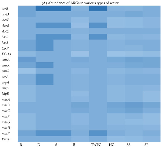 One of the objectives of this study was to explore the ARG content in each matrix and to identify the abundance and shared ARGs among them. The WGS analysis revealed a wide range of ARGs across isolates from different matrices (Figure 3). On average, this study identified 29, 178, 131, 29, 101, 188, 39, and 232 ARGs in the matrices S, SS, SP, TWPC, R, HC, D, and B, respectively. This reveals variations in the ARG content among the different water sources and sample types. The most abundant ARG was found to be mdtB, detected 36 times, followed by emrA, detected 35 times across all water sources. The prevalence of mdtB and emrA genes in these matrices implies that they are widely distributed and may play a significant role in antibiotic resistance within the bacterial populations present in the analysed water sources. These genes are associated with efflux pump systems, which are mechanisms that bacteria use to actively remove antibiotics from the cell, reducing their effectiveness [46].