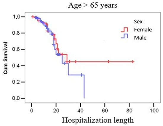 We completed a survival analysis using Kaplan–Meier curves to evaluate the potential correlation between length of hospitalization and mortality in patients over 65 years old. The analysis revealed that in females over 65 years old, the probability of survival decreases to below 60% after 21 days of hospitalization, while in males over 65 years old, survival probability declines to approximately 43% after 25 days of hospitalization (Figure 2).