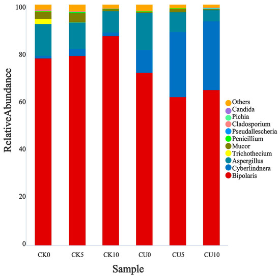To investigate the differences in microbial communities between experimental groups (CU0, CU5, CU10) and control groups (CK0, CK5, CK10), ITS sequencing was performed on fermented feed. The numbers 0, 5, and 10 represent the fermentation duration in days. The PCA-based clustering separated microbial communities into two groups: the control group (CK0, CK5, CK10) and experimental groups, with CU0 clustered with the control group and CU5/CU10 forming a distinct cluster. Fungal communities in the control group and experimental groups CU0 exhibited higher similarity, while those in the experimental groups (CU5 and CU10) demonstrated stronger similarity within their respective groups (Figure 1). Bar plot analysis at the genus level demonstrated that the dominant fungal composition shifted from Biploaris and Aspergillus in the control group to Cyberlindnera and other yeasts in the experimental group (Figure 2). Cluster heatmap analysis of genus-level fungal abundance revealed distinct compositional patterns between groups. The control and CU0 groups were predominantly composed of pathogenic fungi (e.g., Bipolaris, Trichothecium, and Scedosporium) and molds (e.g., Mucor, Trichocladium). In contrast, by day 5 and 10, the experimental groups (CU5 and CU10) showed a marked shift toward yeast-dominated communities (e.g., Candida, Cyberlindnera) (Figure 3). LEfSe analysis identified significant differences in fungal composition from the order to genus level between control and experimental fermented feed samples. Specifically, yeast taxa (e.g., Saccharomyces, Cyberlindnera) were significantly enriched in the experimental group, while the control group and experimental group exhibited higher abundances of pathogenic and saprophytic fungi, including Biplaris, Rhizopus arrhizus, Pleosporaceae, and Dothideomycetes (Figure 4).