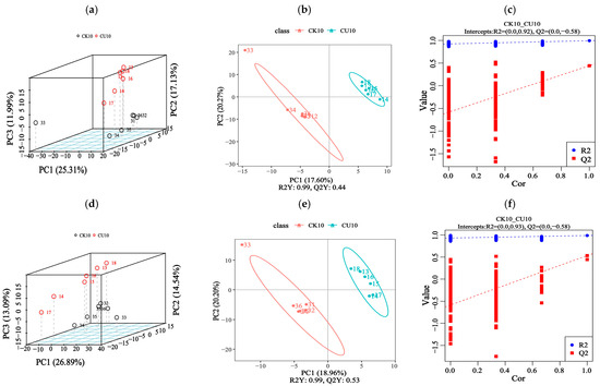 To investigate metabolic changes in fermented feed, LC-MS/MS-based untargeted metabolomics analysis was conducted. We compared feed samples from two groups: the experimental group CU10 and the control group CK10. This approach detected 1313 metabolites through combined positive/negative ion mode acquisition. The principal component analysis (PCA) revealed significant differences in metabolite profiles between the experimental group CU10 and the control group CK10, as demonstrated in Figure 5a,d. The PLS-DA analysis of feed metabolites revealed distinct metabolic profile alterations, with the experimental group CU10 and control group CK10 clearly separated (Figure 5b,e). The PLS-DA models established for the experimental and control groups demonstrated robust validity, with model evaluation parameters obtained through 7-fold cross-validation. The R2 values of all models exceeded their corresponding Q2 values, and the Q2 regression line intercept with the Y-axis was below zero (Figure 5c,f). Collectively, these findings indicate model reliability without overfitting.