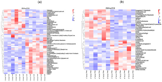 The clustering heatmap analysis of differential metabolites visually demonstrates the distinct clustering patterns between CK10 and CU10, with rows representing clustered differential metabolites and columns corresponding to sample information. Color intensity reflects metabolite abundance, where red indicates upregulated metabolites and blue denotes downregulated metabolites (Figure 7). In the positive ion mode clustering analysis, metabolites significantly upregulated in CU10 included Sclareolide, Sedanolide, sorbic acid, L-saccharopine, 2-aminopimelic acid, chrysin, myricetin, and sclareol; in CK10, marked increases were observed in genipin, LPE 18:2, and 7-methylxanthine (Figure 7a). In the negative ion mode clustering analysis, metabolites significantly upregulated in CU10 included L-ornithine, 2-isopropylmalic acid, aucubin, porphobilinogen, oxyresveratrol, and thiamine, while CK10 exhibited marked increases in metabolites such as tetradecanedioic acid, N-acetylglycine, LPE 18:1, and genipin (Figure 7b).