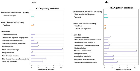 Based on the metabolite classification information provided by the KEGG database, statistical visualization of annotated differential metabolites was conducted. The results demonstrated that in both positive and negative ion modes, these differential metabolites were distributed across three major categories: environmental information processing, genetic information processing, and metabolism (Figure 8). Under positive ion mode, 6 metabolites were involved in environmental information processing, 5 in genetic information processing, and 216 in metabolism. Among these, the metabolic pathways including membrane transport, translation, other amino acid metabolism, cofactor and amino acid metabolism, lipid metabolism, global and overview maps, carbohydrate metabolism, biosynthesis of other secondary metabolites, and amino acid metabolic pathways each contained more than 5 metabolites (Figure 8a). Under negative ion mode, 14 metabolites were involved in environmental information processing, 4 metabolites participated in genetic information processing, and 225 metabolites were engaged in metabolism. Among these, the metabolic pathways, including signal transduction, membrane transport, nucleotide metabolism, metabolism of terpenoids and polyketides, other amino acid metabolism, cofactor and amino acid metabolism, lipid metabolism, global and overview maps, energy metabolism, carbohydrate metabolism, biosynthesis of other secondary metabolites, and amino acid metabolic pathways, each contained more than five metabolites (Figure 8b).