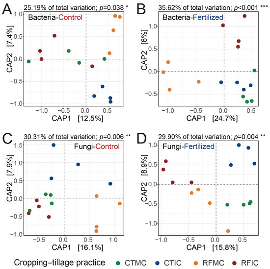 3.2. Microbial Community Across Cropping–Tillage Practices in Soils