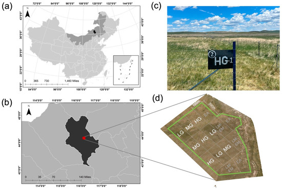 Map of study site in Xilinhot, Inner Mongolia Autonomous Region (a,b). Photographs of experiment plot and layout (c,d), where the nine plots included in this study are indicated with white letters and unused plots are shown with gray letters. Sheep grazing intensities included light (LG), moderate (MG), and heavy (HG).