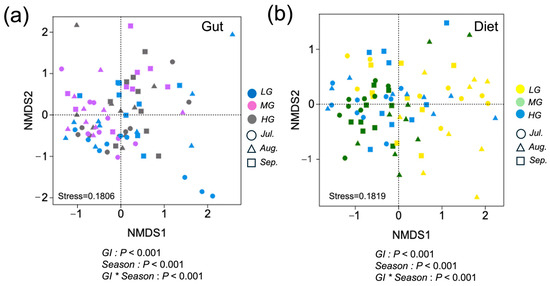 Sheep diet and gut microbiota composition differentiation among grazing intensity and seasonal month, and the interaction of grazing intensity and season (designations follow Figure 1) illustrated by nonmetric multidimensional scaling (NMDS) ordination. Solid circles represent individual gut microbiota distinguished with different grazing intensity for LG (blue), MG (purple), and HG (gray). Different shapes represent individual gut microbiota samples for July (circle), August (triangle), and HG (square) (a). Solid circles represent individual dietary samples for LG (yellow), MG (green), and HG (blue). Different shapes represent individual dietary samples for July (circle), August (triangle), and September (square) (b). Closer sample positions within the ordination indicate more similar diets and gut microbiota. p-values indicate results of PERMANOVA analyses.