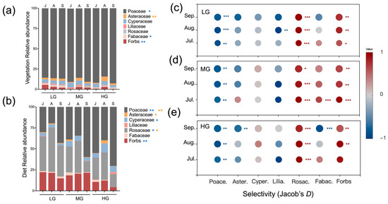 Mean relative abundance of plant families and select forbs within vegetation (a) and sheep diets (b) for seasonal months and grazing intensities (designations follow Figure 1). Mean diet selectivity was based on Jacob’s D index for seasonal months in LG (c), MG (d) and HG (e). Relative abundance ranged from 1 to −1. Diet proportions lower than vegetation proportions indicate avoidance (shown in blue), yet the opposite indicates preference (shown in red). Color shading indicates degree of avoidance/preference and gray symbols indicate when the proportions of diet and vegetation are the same. Seasonal months included July (J), August (A), and September (S). Asterisks indicate significant differences in vegetation and diet composition among seasonal months (yellow) or grazing levels (blue) (* p < 0.05, ** p < 0.01, *** p < 0.001).