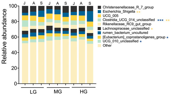 Microbiota composition of sheep guts at the genus level for seasonal month under different grazing intensities (designations follow Figure 1 and Figure 3). Values are relative abundances of the 10 most abundant genera aggregated and colored for each seasonal month. Low abundance taxa are grouped together as “others.” This low-abundance group accounted for 53.9% of total reads, with 29.1% classified to genus level and the remainder assigned to family or higher taxonomic ranks. Asterisks indicate significant differences in microbiota composition among season months (yellow) or grazing levels (blue) (* p < 0.05, ** p < 0.01, *** p < 0.001).