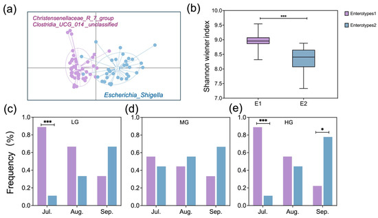 Gut samples formed two distinct enterotype clusters based on Bray–Curtis dissimilarity. Each cluster was driven by variation of its representative genera level: Clostridia_UCG_014_unclassified and Christensenellaceae_R_7_group in Enterotype 1 and Escherichia_Shigella in Enterotype 2 (Figure 5a). Shannon–Weiner diversity index of Enterotype 1 was significantly higher than that of Enterotype 2 (Figure 5b; p < 0.001). The distribution of enterotypes showed temporal variation across months under LG and HG, but not MG (Figure 5c–e). In LG and HG sites, Enterotype 1 predominated in July (p < 0.001), while Enterotype 2 dominated in September for HG (p < 0.05).