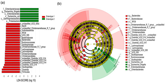 Linear discriminant analysis (LDA) effect-size scores for taxa differentially abundant between Enterotypes 1 and 2 (a). Cladogram generated by LDA effect size (LEfSe) analysis indicates differences in taxa abundance between enterotypes (b). The central dot represents the kingdom (Bacteria), and each successive ring represents the next lower phylogenetic level (phylum, class, order, family and genus). Red areas indicate taxa enriched in Enterotype 1 compared to those in the Enterotype 2, while green areas indicate taxa that were enriched in the Enterotype 2 compared to those in the Enterotype 1. Only taxa with an LDA significance threshold >3.0 are shown.