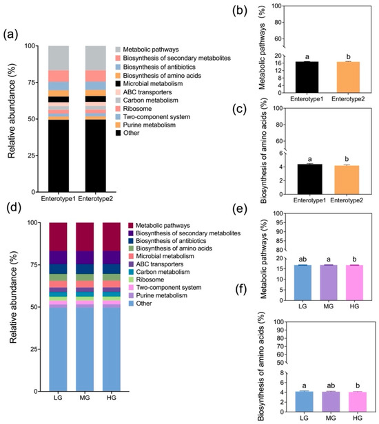 Comparison of the relative abundances for level-3 KEGG pathways between Enterotypes 1 and 2 (a) and among grazing levels (d) (designations follow Figure 1). Mean (±SE; pooled enterotypes) relative abundances for metabolic pathways and biosynthesis of amino acids by enterotypes (b,c) and grazing intensity (e,f). Means followed by the same letter are not significantly different at α = 0.05 based on Tukey’s post hoc test.