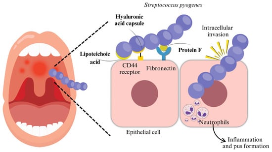 Humans, particularly children, are commonly transiently colonized without overt symptoms. The mechanism through which GAS adheres to epithelial cells is fundamentally represented by the interaction of the bacterial surface with the fibronectin present in the intercellular matrix. This interaction appears to be mediated by a surface protein of nearly 120 kDa, called protein F, which is to be considered the main adhesin of the bacterium (Figure 1).