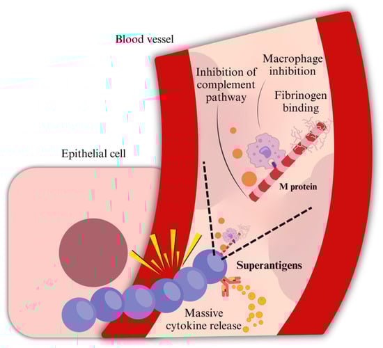 Moreover, GAS produces superantigenic molecules, which enhance its virulence, playing a critical role in toxic shock. “Superantigens” are non-glycosylated low-molecular-weight exoproteins that stimulate a large proportion of T lymphocytes by simultaneously binding to the MHC class II molecules on antigen-presenting cells and to the variable region of the β-chain (Vβ) of the T cell receptor, independently of antigen specificity. This atypical activation bypasses normal antigen processing and leads to a massive, uncontrolled release of cytokines. While antigen-presenting cells release cytokines such as IL-1 and TNF-α, activated T cells predominantly secrete IL-2 and IFN-γ, contributing to systemic inflammation, fever, and in extreme cases, toxic shock [].