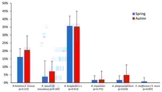 Comparison of tick infection rates for I. ricinus and D. reticulatus with bacterial pathogens during the spring (blue) and autumn (red) periods of peak tick activity (as a percentage of the total examined ticks). The p-value level of significance is shown in parentheses.
