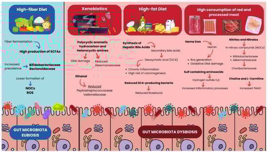 The interactions involving diet and the GM are complicated further by xenobiotics generated during food preparation and cooking. In situations when meat is cooked at high temperatures, compounds such as polycyclic aromatic hydrocarbons (PAHs) and heterocyclic amines (HAs), including PhIP and MeIQx, are produced. These molecules can directly lead to DNA damage [35]. Ruiz-Saavedra et al. found that high intake of these xenobiotics is associated with specific shifts in the GM; for example, diets with elevated PAH levels correlate with reduced Bacteroidaceae and increased Coriobacteriaceae, while high HA intake is linked to a decreased abundance of Akkermansiaceae [39]. Additionally, alcohol consumption, common in Western diets, further disrupts the microbial balance. In subjects with intestinal polyps, ethanol intake above 12 g per day is associated with an increased abundance of Peptostreptococcaceae and a decreased presence of Veillonellaceae, thereby promoting the metabolic activation of pro-carcinogens and contributing to a higher CRC risk [39,40].