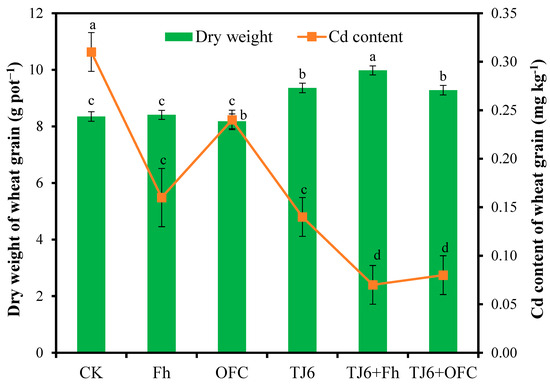Effects of different treatments on dry weight and Cd content of wheat grains. Values are mean plus standard deviation (n = 3), and data with different lowercase letters are significantly different at p < 0.05 according to Tukey’s HSD test.