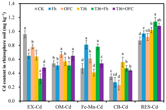 The effects of different treatments on the content of available Cd in wheat rhizosphere soil. The error bars represent ± standard errors (n = 3). The bars indicated by different letters for each Cd morphology are significantly different (p < 0.05) according to Tukey’s HSD test. EX-Cd: exchangeable Cd; OM-Cd: organic-matter-bound Cd; Fe-Mn-Cd: Fe-Mn-oxide-bound Cd; CB-Cd: carbonate-bound Cd; and RES-Cd: residual Cd.