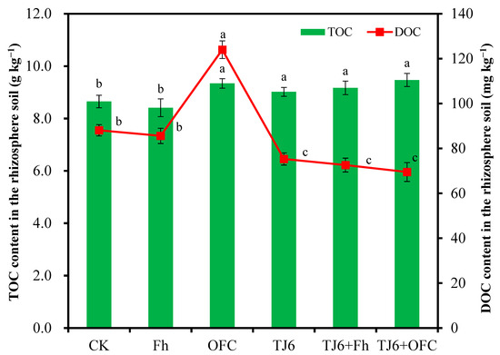 The effects of different treatments on the total organic carbon and dissoluble organic carbon in wheat rhizosphere soil. The error bars represent ± standard errors (n = 3). The green columns represent the content of TOC, and the red lines represent the content of DOC. The bars indicated by different letters are significantly different (p < 0.05) according to Tukey’s HSD test.