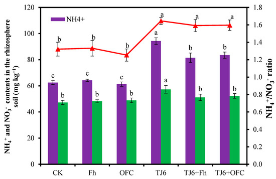 The effects of different treatments on the NH4+ and NO3− contents and the NH4+/NO3− ratio in wheat rhizosphere soil. The error bars represent ± standard errors (n = 3). Purple and green represent the contents of NH4+ and NO3−, respectively. The red line represents NH4+/NO3− ratio. The bars indicated by different letters are significantly different (p < 0.05) according to Tukey’s HSD test.