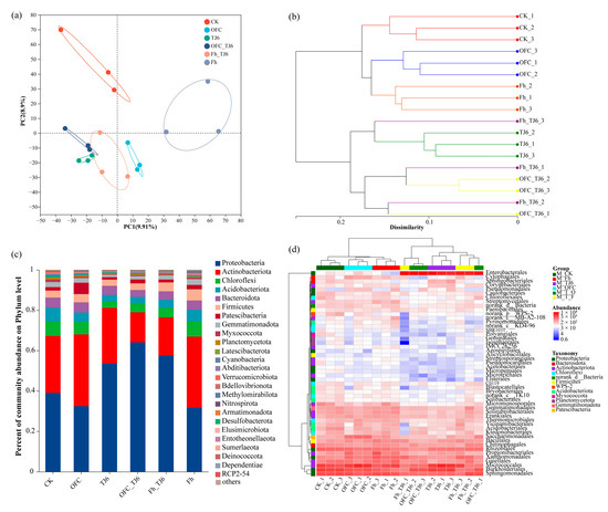 Principal coordinate analysis (PCoA) showed three distinct clusters formed by the CK samples, Fh-treated samples, and OFC-treated samples, whereas the samples treated with TJ6, OFC+TJ6, and Fh+TJ6 were clustered together, indicating that inoculation with strain TJ6 significantly altered the structure of bacterial communities in the rhizosphere soil (Figure 6a). Similarly, the UPGMA tree showed that samples in the CK, Fh, and OFC treatments formed one large branch, while samples treated with TJ6, OFC+TJ6, and Fh+TJ6 formed another large branch, further indicating that strain TJ6 significantly affects the structure of bacterial communities in rhizosphere soil (Figure 6b). In all treatment groups, the proportions of Proteobacteria, Actinobacteriota, Chloroflexi, Acidobacteriota, Firmicutes, and Bacteroidota in the rhizosphere soil exceeded 90% (Figure 6c). Compared to the CK, OFC, and Fh treatments, TJ6, OFC+TJ6, and Fh+TJ6 significantly increased the relative abundances of Proteobacteria and Firmicutes, while they decreased those of Actinobacteriota and Chloroflexi. Additionally, compared to the CK, OFC, and Fh treatments, inoculation with TJ6, OFC+TJ6, and Fh+TJ6 increased the relative abundances of Enterobacterales, Pseudomonadales, Gemmatimonadales, Sphingomonadales, Burkholderiales, and Rhizobiales (Figure 6d), suggesting that these bacterial communities play an important role in resisting Cd stress.