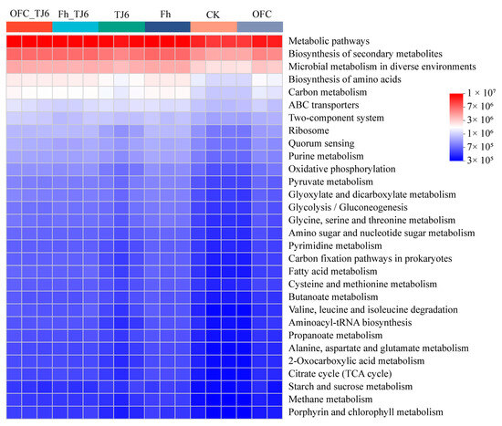 PICRUSt2 function prediction is used to infer information about the functions of microbial communities in environmental samples. By analyzing the functional composition and abundance, PICRUSt2 provides insights into potential microbial functional characteristics during environmental changes. Compared to the CK group, the groups inoculated with strain TJ6 (TJ6, OFC+TJ6, and Fh+TJ6) exhibited significantly increased abundances of genes related to carbon metabolism, the biosynthesis of amino acids, ABC transporters, oxidative phosphorylation, and quorum sensing in the rhizosphere soil (Figure 8). Notably, in the composite passivator treatments, the abundances of genes associated with carbon metabolism, the biosynthesis of amino acids, and oxidative phosphorylation were markedly enhanced, suggesting that bacterial communities carrying these functions extensively colonized the wheat rhizosphere soil.