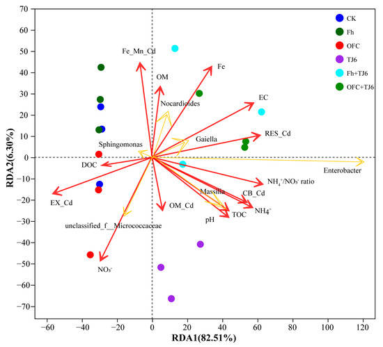 The overall RDA model was statistically significant (F = 3.84, p < 0.05), indicating that the selected environmental variables collectively explained a significant proportion of the variation in bacterial community composition. The constrained variance explained by the model was 22.3%. Permutation tests (999 permutations) further showed that the first constrained axis (RDA1) was significant (F = 4.2, p < 0.05) and explained 14.1% of the variance, whereas the second constrained axis (RDA2) was not significant (p = 0.18). The RDA results indicate that the EX-Cd content in the wheat rhizosphere soil was significantly negatively correlated (r = −0.78, p < 0.05) with pH, EC content, free Fe content, TOC content, and the NH4+/NO3− ratio (Figure 9). Furthermore, the relative abundances of Enterobacter, Nocardioides, Gaiella, and Massilia in the rhizosphere soil were also negatively correlated (r = −0.64, p < 0.05) with EX-Cd levels (Figure 9). In summary, the application of passivators (strain TJ6, Fh, and OFCs) in rhizosphere soil increased the soil pH, EC content, free Fe content, TOC content, and NH4+/NO3− ratio, thereby reducing the bioavailability of Cd. Concurrently, the relative abundances of Enterobacter, Nocardioides, Gaiella, and Massilia were significantly enhanced, synergistically contributing to Cd immobilization and reducing Cd uptake by wheat.