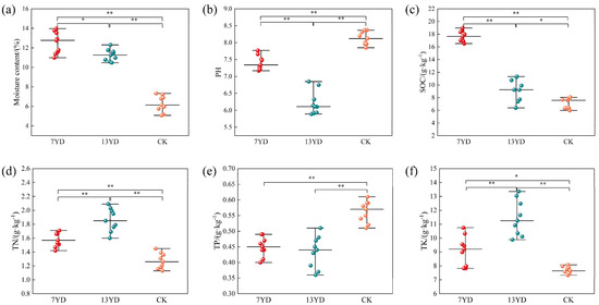 Temporal variation of soil environmental factors along PV array operational duration (* p < 0.05, ** p < 0.01). (a) SWC: gravimetric soil water content. (b) pH: soil pH. (c) SOC: soil organic carbon. (d) TN: total nitrogen. (e) TP: total phosphorus. (f) TK: total potassium.