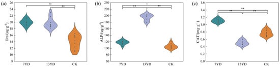 As shown in Figure 3, soil enzyme activities exhibited significant variations under PV panel shading with different operational durations in the study area. Urease activity ranged from 14.02 to 19.95 μg·g−1, showing a non-significant increasing trend in 7YD compared to 13YD, but was 42% higher on average in PV-shaded areas than in unshaded controls (Figure 3a). Alkaline phosphatase (ALP) activity fluctuated between 106.1 and 194.63 μg·g−1, demonstrating a linear increase with longer PV panel operation (p < 0.05; Figure 3b). Notably, catalase activity showed highly significant differences among zones (p < 0.01), with 7YD exhibiting a 47% increase (p < 0.01) compared to CK, while 13YD showed a 33% reduction (Figure 3c).