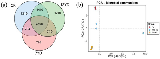 Venn network analysis (Figure 6a) revealed the OTU distribution characteristics of soil microbial communities across the study sites (7YD, 13YD, and CK), with a total of 8278 OTUs detected. Among these, 2050 core OTUs (24.8% of the total OTU library) were shared among all three sites, demonstrating the conservation of core microbiomes across different treatments. The number of shared OTUs positively correlated with community similarity. Site-specific OTUs showed gradient variations: 7YD, 13YD, and CK contained 798 (18.43%), 1218 (22.44%), and 1319 (23.93%) unique OTUs, respectively. Notably, the relative abundances of shared OTUs reached 47.33%, 37.78%, and 37.18% in 7YD, 13YD, and CK, respectively, indicating substantial similarity in soil microbial composition across the different treatment areas.
