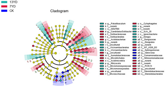 Furthermore, the cladogram (hierarchical evolutionary branching diagram) provided additional insights, demonstrating that the 13YD plots were primarily characterized by the significant enrichment of Paludibaculum, a facultative anaerobe capable of dissimilatory iron reduction within Subgroup 3 of the Acidobacteriaceae family. In contrast, the 7YD plots exhibited a prominent enrichment of Acidobacteria, while the CK plots were dominated by the Variovorax genus belonging to the Betaproteobacteria class within the Proteobacteria phylum.