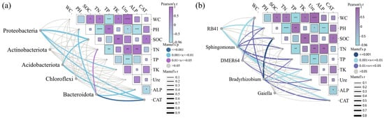 The ecological interactions network tested by the Mantel test indicated that soil environmental factors and enzyme activities had significant phylum-specific driving effects on bacterial community composition. As shown in Figure 8a, at the phylum level, there were highly significant correlations (p < 0.01) between the abundance of Proteobacteria and the activities of SOC, TK, and CAT. Acidobacteriota abundance was likewise strongly regulated by SOC and TK, with which it was highly significantly correlated (p < 0.01). The main factors affecting Bacteroidota were PH, TN, and CAT, with highly significant correlations between Bacteroidota and PH and CAT (p < 0.01) and significant correlations with TN (p < 0.05). In contrast, there was no significant correlation (p > 0.05) between Actinobacteria and Chloroflexota and both soil environmental factors and enzyme activities. As shown in Figure 8b, there was a highly significant correlation (p < 0.01) between the abundance of RB41 and PH and CAT at the genus level. In contrast, there were significant correlations between Sphingomonas and both soil environmental factors and enzyme activities, with highly significant correlations (p < 0.01) with WC, Ure, and ALP. In addition, DMER64 was significantly correlated with PH and ALP (p < 0.05). Bradyrhizobium was significantly correlated with WC, Ure, and CAT, and was highly significantly correlated with SOC (p < 0.01), whereas there was no significant correlation (p > 0.05) between Gaiella and both soil environmental factors and enzyme activities. The global analysis showed that PH and enzyme activities were the main factors affecting the composition of bacterial communities, and their “enzyme activity–redox-nutrient coupling” mechanism provided key biomarkers for the prediction of soil microbial functions under the shade of photovoltaic panels.