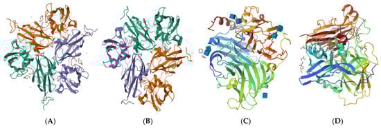 The three-dimensional structures of typical laccases (A), Streptomyces coelicolor; (B), Streptomyces carpinensis; (C), Trametes versicolor; (D), Bacillus subtilis. Structural data were obtained from the PDB database).
