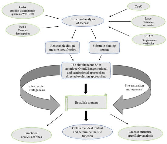 Directed evolution processes the target gene directly at the molecular level; then, high-throughput screening methods are used to improve the performance of the target laccase. In recent years, there have been two main directed evolution techniques for obtaining improved laccases, which are based on the protein sequence and structure []. Through directed evolution and structural-analysis-based mutagenesis technology, each laccase is engineered to obtain improved properties or new functions. A directed laccase evolution experiment was successfully carried out in order to improve pH stability [], enhance catalytic activity on specific substrates [], and produce resistant laccase [].
