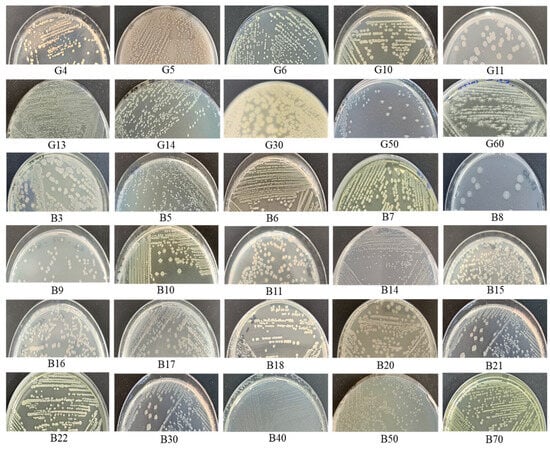 Aerobic thermophilic bacteria were successfully isolated from hot spring samples and exhibited notable phenotypic diversity. Colonies on solid media showed a wide range of morphologies. Most were circular, with smooth or slightly wavy edges, and smooth to shiny surfaces, in colors ranging from off-white to pale cream (e.g., Brevibacillus aydinogluensis G4, Brevibacillus aydinogluensis G6, Geobacillus proteiniphilus B11, Geobacillus kaustophilus B14, Geobacillus vulcani B18, and Geobacillus kaustophilus B22). Some colonies were star-shaped with similar surface characteristics (Aneurinibacillus thermoaerophilus G60). Others presented distinctive appearances, including colonies with radial filaments and saturn-like colonies (e.g., Geobacillus kaustophilus G10, Geobacillus stearothermophilus G14, Brevibacillus thermoruber G50, Geobacillus kaustophilus B21, and Geobacillus thermoleovorans B30), and others have a dense and opaque central region, followed by a clearer area, then become dense and opaque at the edges (Geobacillus proteiniphilus G11, G. thermoleovorans B8) (Figure 1). All isolates were Gram-positive and catalase-positive, exhibiting rod or filament-shaped cells under microscopic observation. In terms of growth conditions, all isolates tolerated temperatures between 45 °C and 75 °C, with optimal growth observed at 70 °C (43.3% of isolates), 60 °C (23.3%), and 55 °C (33.4%). Notably, some isolates tolerated 80 °C, indicating high thermotolerance. pH tolerance ranged from 5.0 to 10.0, with optimal growth between pH 6.0 and 8.0. Isolates grew in up to 3% NaCl, with optimal growth at 1%, indicating moderate halotolerance.