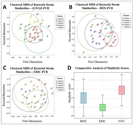 Comparative analysis of similarity index distributions and scores among thermophilic isolates assessed by (GTG)5-PCR, BOX-PCR, and ERIC-PCR techniques. Clustered multidimensional scaling (MDS) representations were generated to visualize bacterial strain similarities for each method: (GTG)5-PCR (A), BOX-PCR (B), and ERIC-PCR (C), with numbers representing unique isolates and colors indicating genetic clusters. A box plot (D) compares the similarity scores obtained across the three techniques, highlighting differences in variability, central tendency, and discriminatory resolution among the methods.