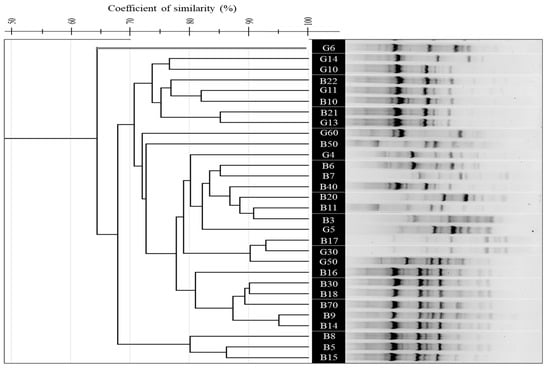 The (GTG)5-PCR profiles showed tight clustering, with Dice similarity coefficients ranging from 65% to 95%, indicating moderate to high genetic relatedness. The G. kaustophilus isolates B5, B10, and B70 formed compact clusters, while Bacillus licheniformis G30 and B. paralicheniformis B3 clustered together, suggesting limited interspecific resolution. Isolates from Hammam Debagh and Hammam Bouhadjar occasionally clustered together, indicating shared genomic features. (GTG)5-PCR profiles revealed significant diversity, particularly in the middle (for B. licheniformis G30 to A. thermoaerophilus G60) and lower sections, while the upper lanes were more homogeneous, with sharp, well-defined bands and minimal background noise (Figure 2A and Figure 3).
