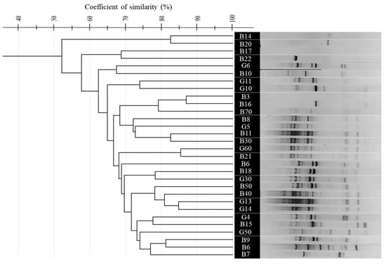 In contrast, BOX-PCR showed a broader spatial distribution in the MDS plot, with Dice similarity values ranging from 50% to 90%. Certain isolates, like G. thermoleovorans B30 and B. licheniformis G30, were outliers, indicating distinct genomic fingerprints. A. pallidus isolates (B40, B50) were clearly separated, while B. aydinogluensis (G4, G5) remained closely grouped. Several strains, including Geobacillus stearothermophilus G13, G. stearothermophilus G14, and G. thermoleovorans B30, consistently clustered together. The BOX-PCR gel displayed distinct banding patterns, with some strains (e.g., G. kaustophilus B9, G. kaustophilus B10, G. kaustophilus B15) showing unique profiles, while others (e.g., G. kaustophilus G10, G. kaustophilus B5, G. kaustophilus B14) were closely related (Figure 2B and Figure 4).