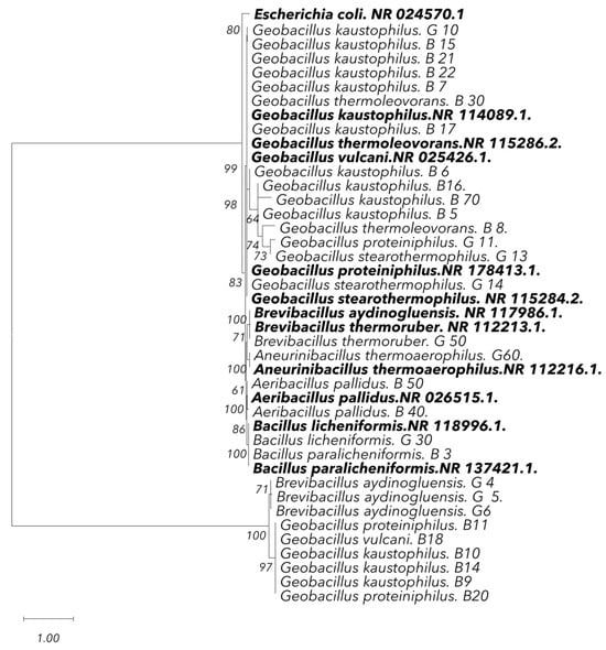 Genomic DNA was extracted from freshly grown bacterial isolates cultivated in NB at 60 °C using the PureLink Genomic DNA Mini Kit (Thermo Scientific, Waltham, MA, USA), with 50 µL of lysozyme (40 mg/mL) to improve cell lysis [39]. The process followed the manufacturer’s protocol, including centrifugation and pellet recovery. DNA concentration and purity were assessed with a ScanDrop spectrophotometer (Analytik Jena, Jena, Germany). DNA integrity was verified by gel electrophoresis on a 0.8% agarose gel. Samples were stored at −20 °C for future use.