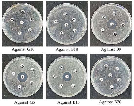 Agar well diffusion assay showing inhibition zones (clear halos) around wells containing thermophilic bacterial isolates. Six isolates (B16, B30, B70, B8, G14, and G4) were tested against six target isolates (G10, B18, B9, G5, B15, and B70). Wells are labeled according to isolate numbers (16, 30, 70, 8, 14, 4) on each Petri dish, which is labeled with the corresponding target isolate. The size of the clear halo around each well reflects the antimicrobial potency of the isolate. Inhibition zone diameters were measured to compare the effectiveness of the isolates.