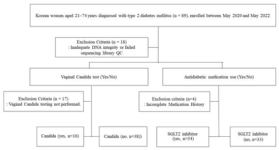 Eighty-nine women aged 21 to 74 years who had been diagnosed with T2DM and had received medical treatment for at least six months were enrolled in the study. To minimize potential alterations in the vaginal microbiota, women who were using any topical vaginal treatments were excluded. Of these, 18 cases with DNA quality control (QC) and Library QC failures were excluded in the DNA extraction and 16S rRNA gene sequencing analyses. Finally, seventy-one women were enrolled in this study analysis (Figure 1).