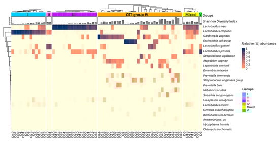 A heatmap analysis was performed to assess the relative abundances (%) of 22 representative vaginal microbial species in the 71 women with T2DM (Figure 2). Hierarchical clustering identified distinct CST profiles, defined by dominant Lactobacillus species. CST IV and Mixed groups exhibited greater microbial diversity and higher proportions of anaerobic bacteria. These CSTs were more frequently observed in women with T2DM, whereas CST I appeared at a lower frequency overall but was still detected in several subgroups.