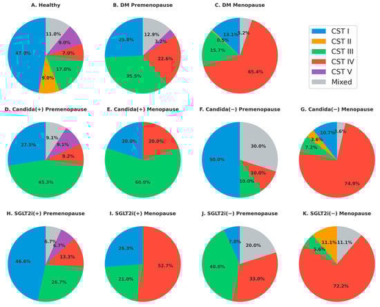 Representation of vaginal bacterial CSTs across clinical subgroups of women. (A) Healthy women (n = 100); (B) women with T2DM, premenopausal; (C) T2DM, menopausal; (D) T2DM with Candida infection, premenopausal; (E) T2DM with Candida infection, menopausal; (F) T2DM without Candida infection, premenopausal; (G) T2DM without Candida infection, menopausal; (H) T2DM with SGLT2 inhibitor use, premenopausal; (I) T2DM with SGLT2 inhibitor use, menopausal; (J) T2DM without SGLT2 inhibitor use, premenopausal; (K) T2DM without SGLT2 inhibitor use, menopausal. CSTs: CST I (blue, Lactobacillus crispatus-dominant), CST II (orange, Lactobacillus gasseri-dominant), CST III (green, Lactobacillus iners-dominant), CST IV (red, Lactobacillus-depleted, anaerobe-rich), CST V (purple, Lactobacillus jensenii-dominant), Mixed (gray, heterogeneous or non-dominant composition).