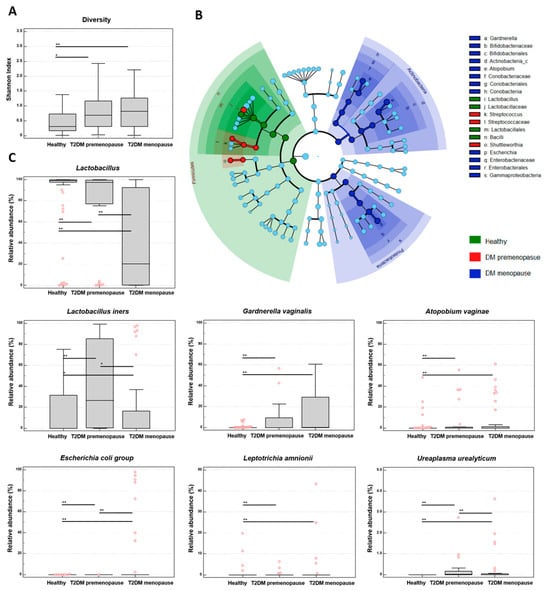Differences in vaginal MTPs among healthy women and women with T2DM, stratified by menopausal status. (A) Shannon diversity index was significantly higher in both the premenopausal (n = 31) and menopausal women with T2DM (n = 40) groups compared to healthy women (n = 100) (p = 0.0006, Mann–Whitney U test). (B) Cladogram based on LEfSe analysis showing phylogenetic distribution of significantly enriched taxonomic biomarkers (linear discriminant analysis [LDA] score ≥ 4) among healthy, T2DM premenopausal, and T2DM menopausal groups. (C) Relative abundances (%) of significantly different vaginal microbial taxa among healthy women, premenopausal women with T2DM, and menopausal women with T2DM. Red circles indicate individual sample values. Statistical significance was determined using non-parametric tests; p < 0.05 (*), p < 0.01 (**).